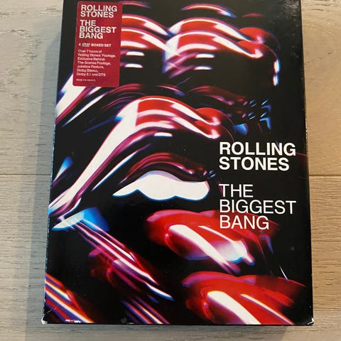 Rolling Stones The Biggest Bang musikkalbum med 4 DVD-er. Inneholder konserter spilt i ulike land og byer, inkludert Rio de Janeiro, Budapest, Argentina, Japan, Kina og mer. Albumet dokumenterer en karriere med superlativer og omfattende liveopptredener. Er i meget god stand bortsett fra en rift i pappesken.