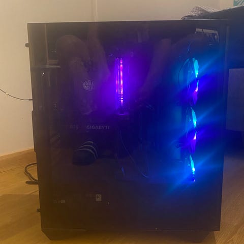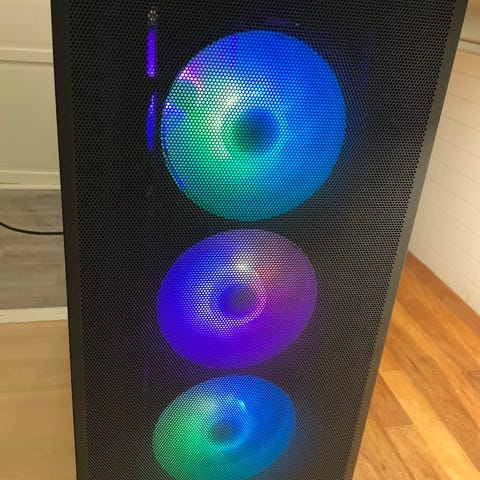 Asus Gaming PC Stasjonær PC med RGB-belysning. PC-en har et transparent sidepanel som viser interne komponenter og kjølesystem. Kabinettet er svart med flere vifter for god luftstrøm. Passer til gaming og krevende databruk.