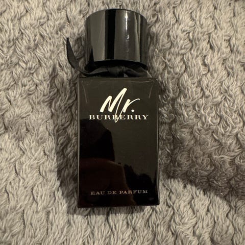 Åpnet, men nesten full flaske med herreparfyme fra Mr. Burberry.