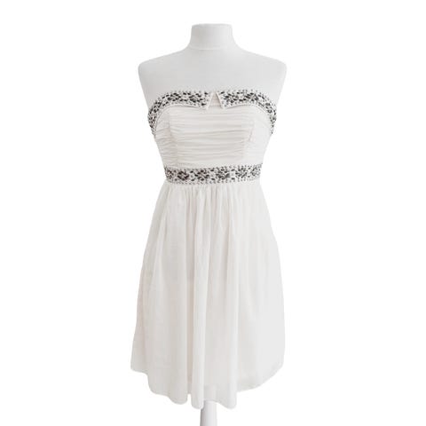 Kjolen er pent brukt. Lapp med størrelse var synlig gjennom blondene og er derfor klippet av. Trolig størrelse 34/36, men se mål. Brystmål fra armhule til armhule er 40 cm, livvidde fra side til side er 34 cm og hel lengde fra skulder og ned er 147 cm. Overdelen er i 55% bomull, 30% viskose og 15% polyamid, mens skjørtet er i 100% polyamid.