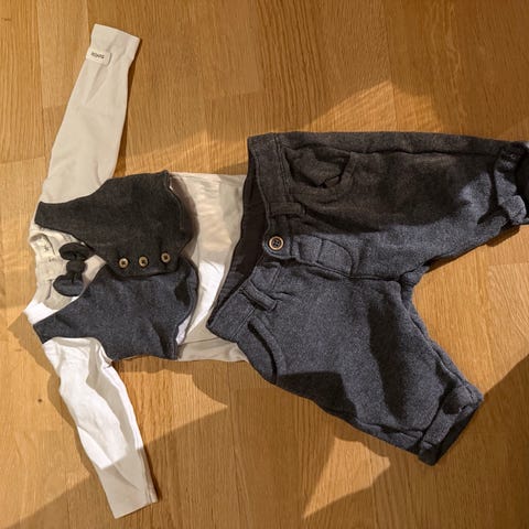 Newbie penklær til gutt selges i strl. 62. Kun brukt 1 gang. Settet inneholder bukse, body, bukseseler og sløyfe. Sløyfen kan taes av.