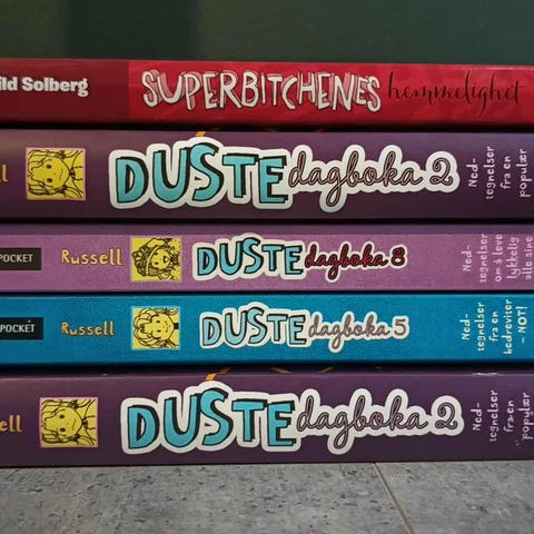 Sandra Rudeberg Dustedagbøker barnebøker i fargerike innbundne utgaver. Settet inkluderer flere bind med varierende farger på omslaget, egnet for barn som leser eller samler på barnebøker.