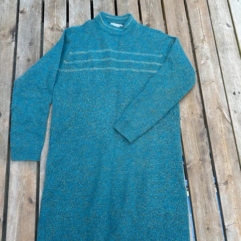 Selger en pent brukt strikke kjole fra Fransa i str M. Den har rund hals, lange ermer. Burgunder melert farge med gull dekor øverst i front.