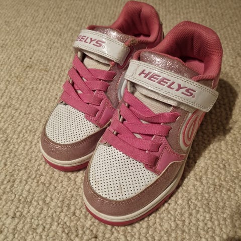 Gøyale rullesko selges. Hjulet under skoen kan tas ut ved å trykke på knappen bak og tas inn igjen når barnet bare vil bruke de som vanlige sko.