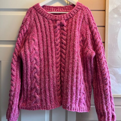 Selger en hjemmestrikket Holme-genser (oppskrift fra MinMote) i en nydelig bringebærrød farge.
