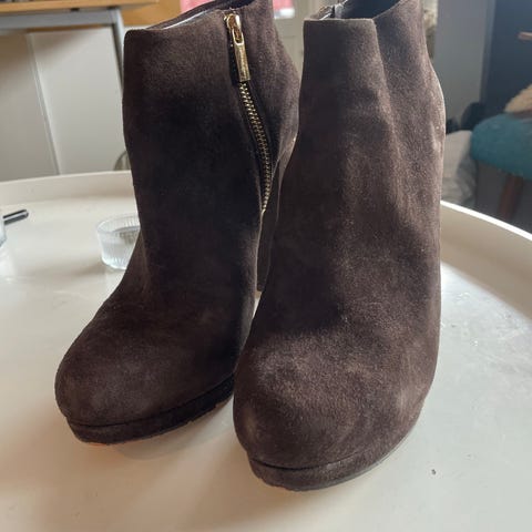 Ca. 9 cm hæl. Har glidelås på innsiden.