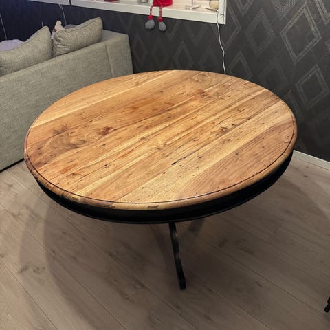 Lakken flasser. Trenger en solid oppussing. Stødig. Ingen ødelagte deler. Bordet må hentes.
