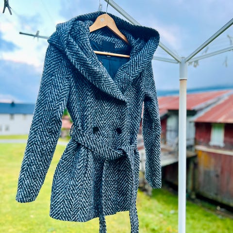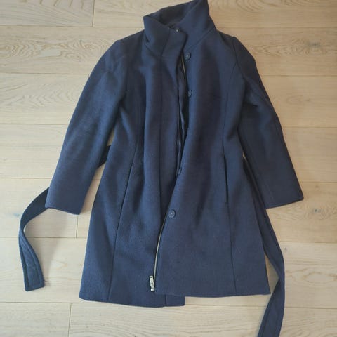 AMISU Kåpe i blå farge, størrelse 36 for kvinner/barn. Kåpen har belte og knappelukking. Materialet er ull.kåpen har glatt foring innvendig. Passer til bruk som ytterplagg. Brukt 2 ganger.