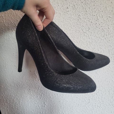 Pensko i glitter fra Bianco, kjøpt 2011 om jeg husker rett. Brukt noen ganger i perioden etterpå. Mye sko igjen i de. Litt mindre glitter på noen steder, der skoene av og til møtes, på innsiden og på hælen. Se bilder for bedre forklaring. Har ikke vært brukt på over ti år. Perfekte til tiden vi går inni, julebordsesongen!