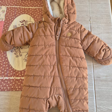 H&M unisex vinterdress i brun farge, størrelse 74. Laget for barn, egnet for kaldt vær med polstring for varme. Dressen har hette og glidelås foran for enkel påkledning.