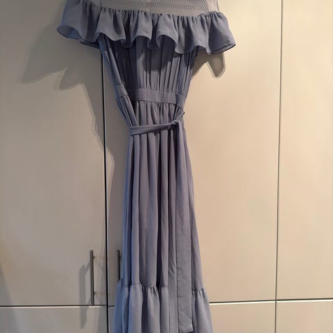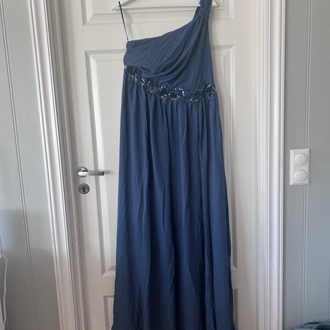 Nelly festkjole i blå farge, designet for kvinner i størrelse 38. Kjolen har en plissédetalj og en asymmetrisk skulder med volanger. Materialet er lett og flytende, egnet for formelle anledninger.