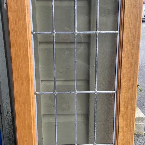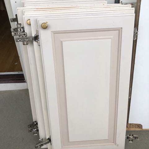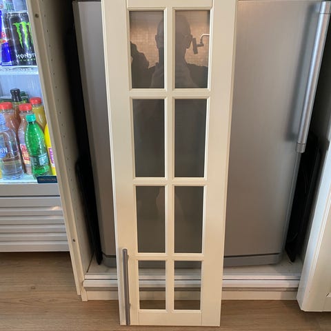 Har metallhåndtak og hengsler montert. Passer til kjøkkenskap, brukt til utskifting eller reparasjon.