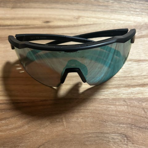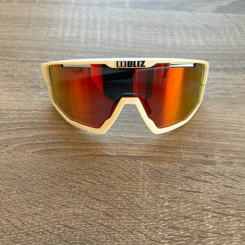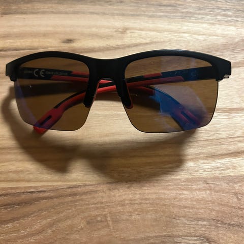 Sportsbriller/«raske briller» fra Ryders selges billig. Et komplett sett med 2 ekstra glass i rødt og klart glass i tillegg til solbrilleglass.