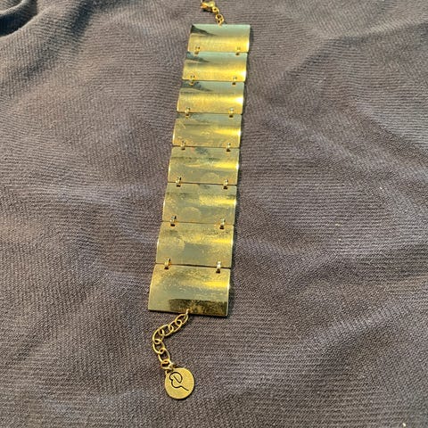 Dette utsøkte armbåndet har en elegant rem i sterlingsølv med et intrikat detaljert innleggsdesign. Armbåndets midtpunkt er et livlig panel av rikt rødt materiale, kunstnerisk utsmykket med et delikat blomstermotiv. Blomsten er laget av skinnende perlemor, der hvert kronblad er omhyggelig formet og satt for å skape en naturalistisk effekt. Blomstens sentrum er fremhevet med et lite, gyllent element, som gir et snev av eleganse og kontrast.