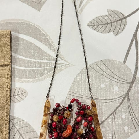 Øredobbene har en lengde på omtrent 11 cm, med perler i flere nyanser av rødt og innslag av grønt.