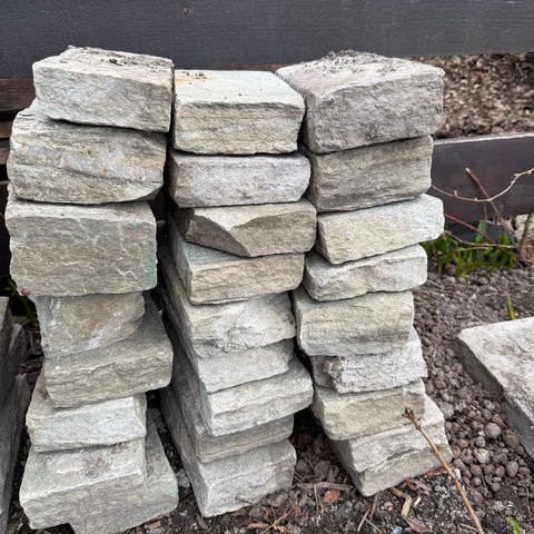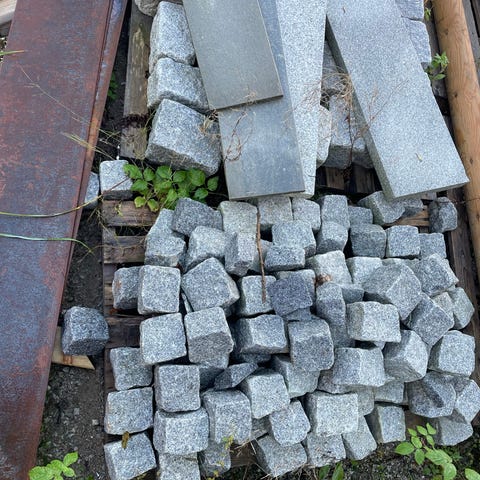 Hele og fine granitt steiner selges., som lett kan slåes av med en hammer/slager. Ligger på pall, og kan hjelpe med til og løfte dem