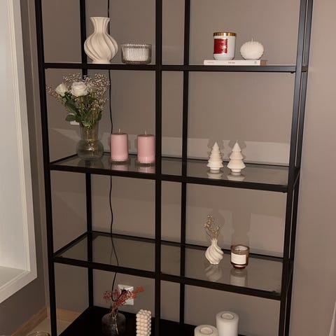 Hjørne hylle av metall kjøpt fra jysk , glass hyller mangler 1 og 2 metall hyller