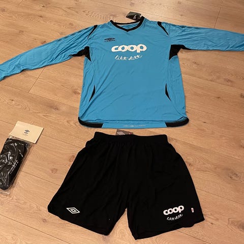 Selger for 250kr + frakt en komplett keeperdrakt fra Umbro. Keeper trøye str XL, shorts str XL, sokker str 40-44. Trøyen har nr 1 på ryggen. Fargen marineblå på alt. Litt mindre i størrelse,så kan passer nesten som en vanlig L.