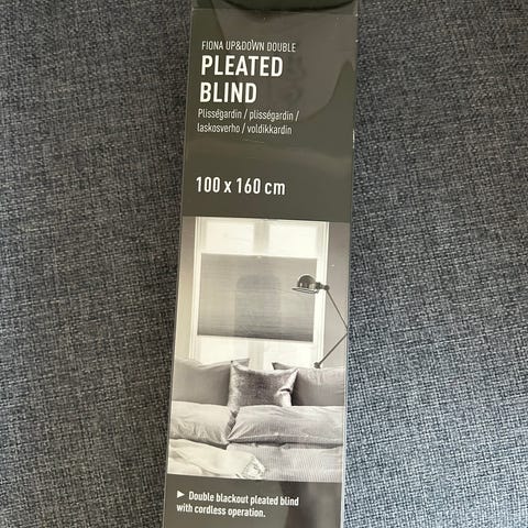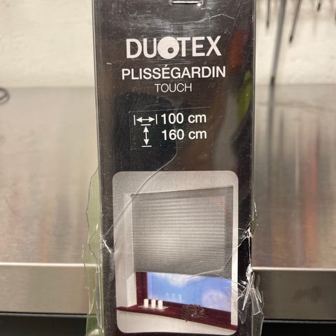 KI: "Hvitt plissegardin til dør, tilpasset for å dekke dørens glassflate. Gardinet kan justeres i høyden for å dekke øvre eller nedre del av døren, som vist på bildene. Egnet for å gi skjerming og redusere innsyn samtidig som det slipper inn lys."