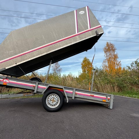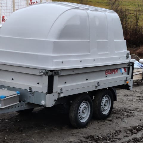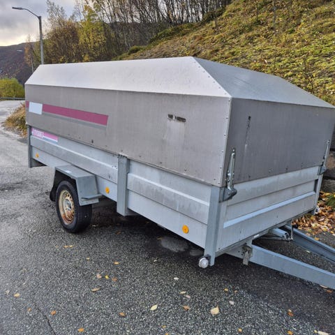 Tilhengeren har en solid metallramme med galvanisert stål og et hvitt, buet plastlokk som dekker lasteområdet. Egnet for transport av diverse varer som krever beskyttelse mot vær og vind. Utstyrt med enkle låsemekanismer og håndtak for åpning av lokket. Passer for generell bruk og transportbehov.