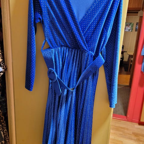 Blå Paris Pink kjole med detaljer på skuldrene. Lengde ca 102 cm, størrelse L. Stor utrigning, men den ene siden kan legges over den andre siden. Så utrigninen ikke trenger å bli så stor.