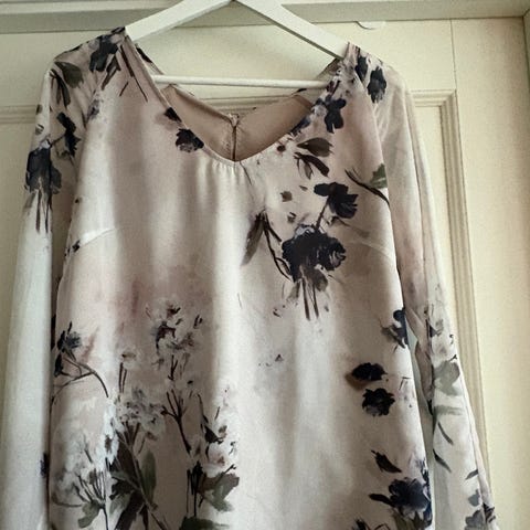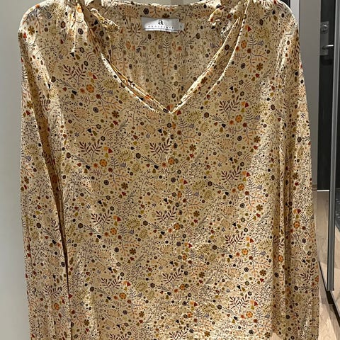 Nydelig bluse fra Riccovero med fine detaljer. Kan lukkes i halsen med en knapp, eller holdes oppe. Knapper i mansjettene, og en liten splitt i hver side. Lysere brun bunnfarge, og småblomstret mønster i hvitt, sort og litt mørkere brun. Str. 38. Benyttet kun en gang og god som ny.