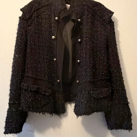 # BLAZER - litt overdimensjonert og lengre - lukking med knapper t - 3 lommer uten klaff foran - V-hals med krage - med fôr - polstrede skuldre.