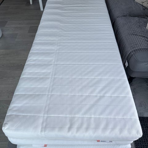 Springfjærmadrass og overmadrass, 75x200 cm (de svarte madrassene på bildet). Kjøpt ny på Møbler og utstyr i Dale for omtrent to år siden. Nypris i overkant av 2000 kr, om jeg husker rett. De har lagt i gjesteseng og er nesten ikke brukt. Ingen flekker eller merker.