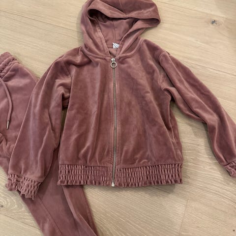 Mykt kosesett i velur fra KappAhl, str86. Kjøpt nytt og brukt av et barn. En liten tusj strek på arm, jeg ikke får av, og glidelåsen på bildet er litt slitt i bunnen, se egne bilder! Ellers uten observerte merker.