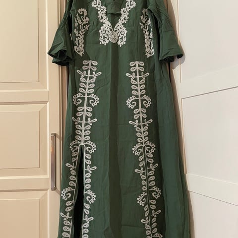 Grønn kjole med mønster i bryst og arm selges rimelig.
