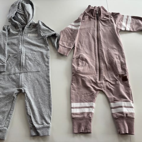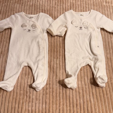 H&M 2 stk unisex baby heldrakt i størrelse 50 og 56. Laget for spedbarn, med hette og glidelås foran for enkel påkledning. Materialet er mykt og egnet for små barn.
