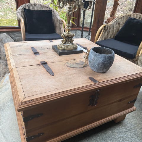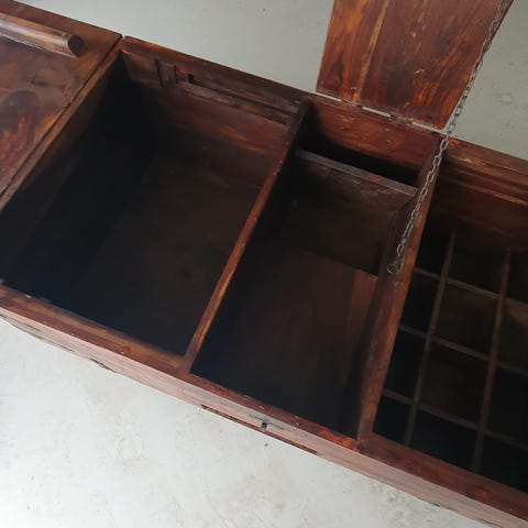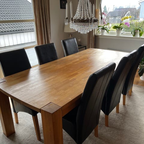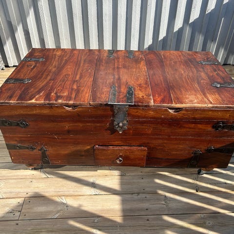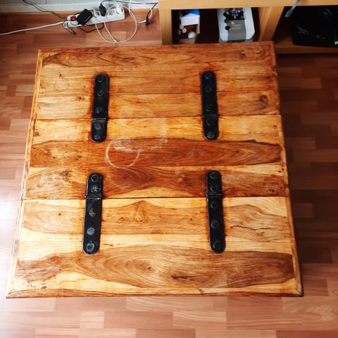 Meget solid kistebord med meget god plass. Vi har satt på hjul å lettere å flytte da det er solid og tungt. Normale bruksmerker men god behandlet om olje. Hentes her asap