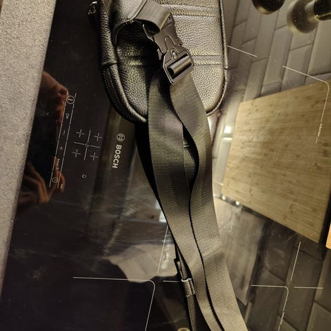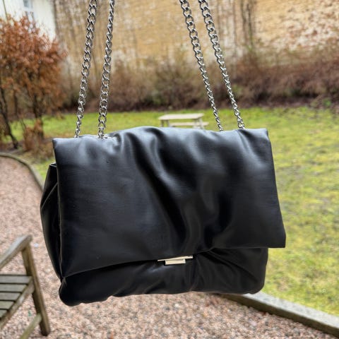 H&M Stoff Skulderveske i svart farge. Vesken har flere lommer inkludert en hovedlomme med glidelås og en innvendig nettinglomme for organisering av små gjenstander.