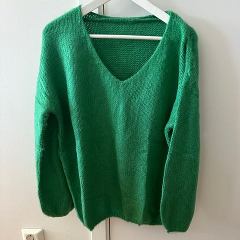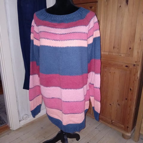 Vet ikke navn på genser og heller ikke hvilket garn den er strikket i. Men den er veldig myk og god, litt oversize look.