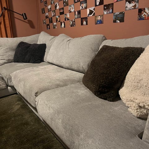 Selger min knallgode Optimal vinkelsofa med relaxhjørne/sjeselong fra Topline, mørk grå velurstoff ( enkel å rengjøre).