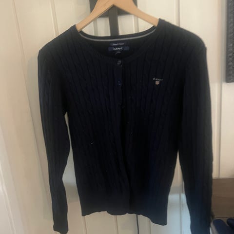 Klassisk Gant-genser i kabelstrikk med v-hals. Mørkeblå. 85% merinoull og 15% nylon. Merket med str. XXL, men synes den passer fint til str. L. (Modellen er relativt ettersittende, men elastisk. Passer derfor også M og XL, dog liten i størrelsen til å være XXL.) Kun brukt ved en anledning og god som ny. Ordinær pris kr. 2.000,-.