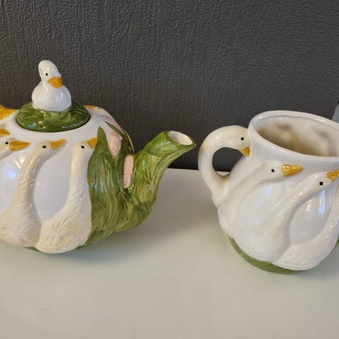 Inneholder te kanne, sukker kopp, fløte mugge og drikkekopp.