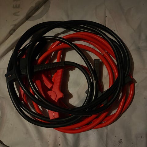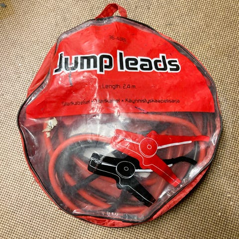 Jump Leads startkabelsett med en lengde på 2,4 meter. Kabelsettet har røde og svarte klemmer for enkel tilkobling til bilbatterier. Designet for å overføre strøm mellom kjøretøy for å starte en bil med utladet batteri.