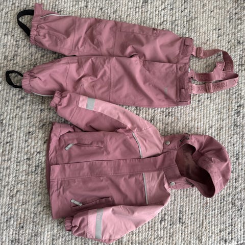 Reflex barneklær sett i størrelse 98 for jenter. Sett består av jakke og bukse i rosa farge. Materialet er tilpasset barn med elastiske mansjetter og refleksdetaljer for økt synlighet. Buksen har forsterkede knær for bedre slitestyrke.