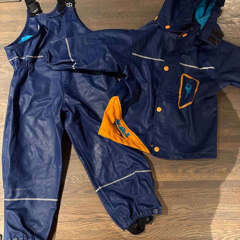Regntøy fra Vossatasser. Pent brukt. Den er i str 120, men Finn.no har ikke det utvalget, så derfor står det 122. Votter inkludert, helt nye. Fikk i gave, men ble aldri brukt. Selges samlet for 200,-