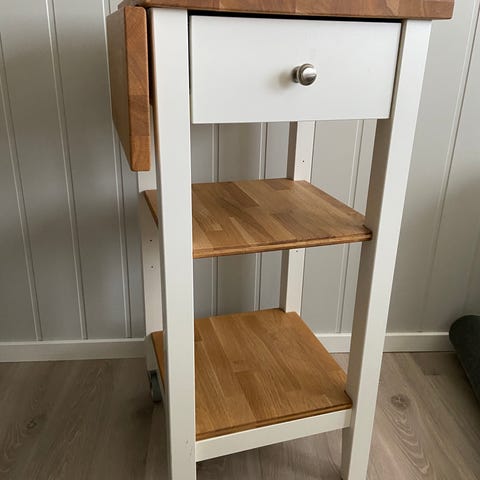 Pent brukt IKEA STENSTORP trancherbord i hvit/eik. Praktisk skuff, to flyttbare hyller i heltre eik med riller til flasker på den ene siden – kan snus og brukes helt flate på den andre siden. Nederst hylle i stål.