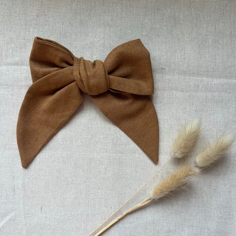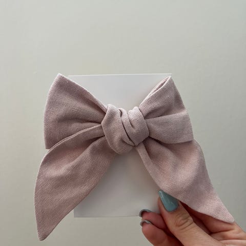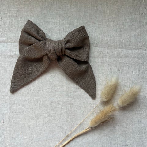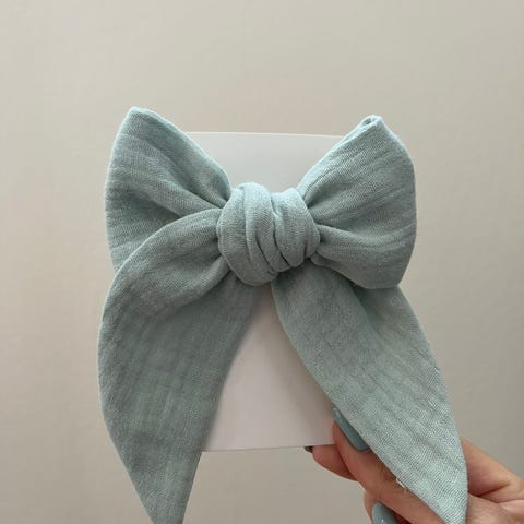 Laget av myk musselin. Designet som en stor sløyfe som kan brukes til å feste og style hår.
