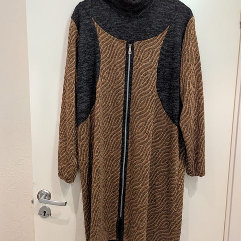 Stor, tykk, varm kosegenser/tunika/kjole med hette som du kan gjemme deg i på kalde dager. Ca 100cm lang fra skulderen. Kjøpt i Skottland. Nesten ikke brukt. Bra å ha på hytta!