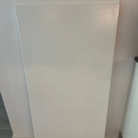 Har skruehull på begge sider og en utskjæring (se bilde for mål). Dersom denne skal være mellom to skap er den helt topp for det, men pga skruehull på begge sider, vil den ikke fungere som sideplate ytterst på kjøkken.