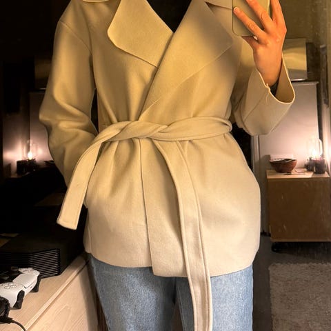 New Look Kåpe i beige farge, størrelse 40 for kvinner. Jakken har glidelåslommer og en klassisk kåpestil med knappedetaljer. Materialet er ikke spesifisert, men kåpen har en glatt foring og en struktur som gir et pent og tidløst utseende.