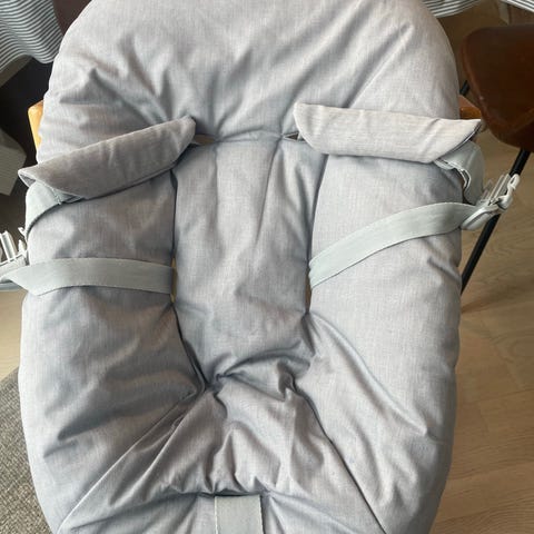 Selger et babysete med brett til Stokke steps. Pent brukt av to barn. Selene er tatt av på bilde da vi akkurat har vasket trekket før salg, men de er festet på igjen nå :)