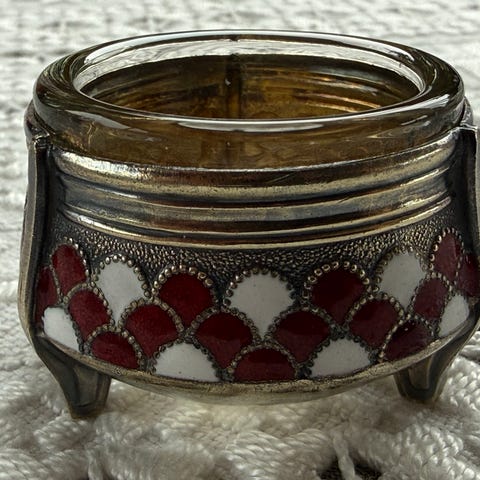 Russisk saltkar i art deco stil med dekor av bær / blader / rognebær (?). Blank glassinnsats i sølvbelagt (?) metall med emalje i lysegrønn og mørkerød farge. Se bilder for mål. Er stemplet, se bilder.