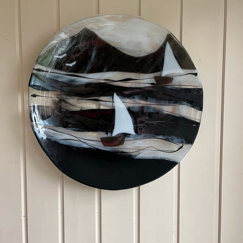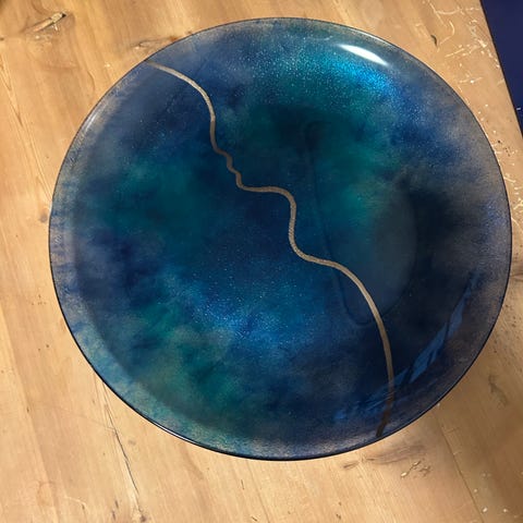 Fat er laget av glass og står på en svart smijernsbase. Kan tas ut av stativet og brukes som skål på salongbord. Kun brukt som pynt i vårt hjem.