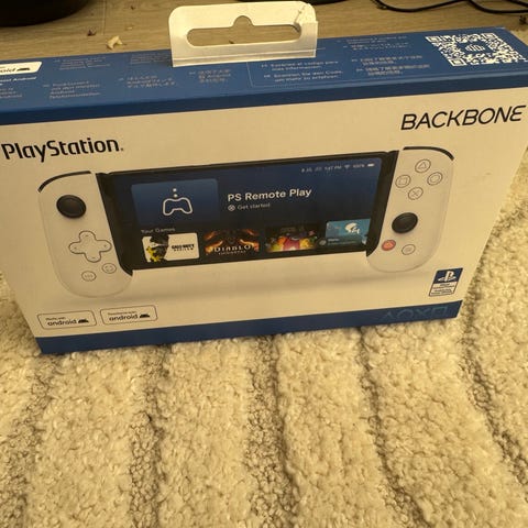PlayStation Backbone One mobilspillkontroller i hvit farge. Designet for bruk med mobiltelefoner for forbedret spillopplevelse. Inkluderer kontroller med knapper og joysticks, samt tilkoblingskabel. Egnet for spillere som ønsker en fysisk kontroller til mobilspill.