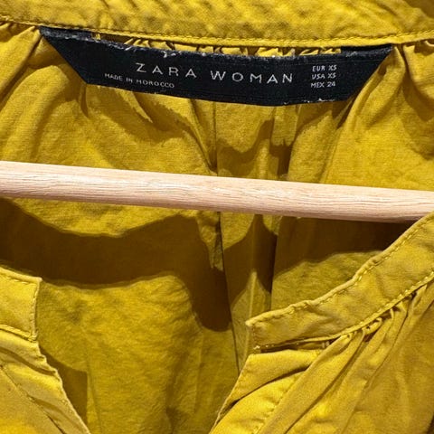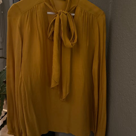Chiffon-bluse med sløyfe ved halsen. Gul med knepping foran. Fra Zara. Pent og lite brukt.